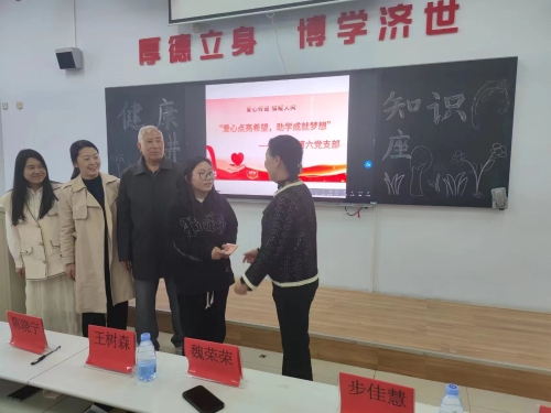 为解决困难学生家庭经济负担,关心关爱学生成长,离退休第六党支部党员老师主动关怀,为护理系经济困难学生进行爱心资助。仪式于2023年4月14日下午在教学楼207教室举行,原校长张树峰、离退休第六党支部书记陈晓宁、支部组织委员靳景利、支部宣传委员王树森、党员张树斌、原军事教研室主任于群、离退休人员管理处老师杨莹、档案室主任姚大明、护理系2021级辅导员魏荣荣和步佳慧以及受资助的学生参加仪式。 离退休第六党支部书记陈晓宁代表党支部全体党员同志将收集的资助金2200元交给受资助学生,并嘱咐学生要不惧困难、踏实肯干、努力学习,增强自身本领,成为奉献社会的有用之才。随后,受资助学生向老师们表达了感激之情并表示一定会认真学习,克服经济上的困难,一心向学。最后,辅导员老师魏荣荣再次向第六党支部党员老师们表达感谢并寄语受资助学生,鼓励其要拥有积极向上的人生态度和勇攀高峰的勇气。 (点击每张图片即可查看原图)
