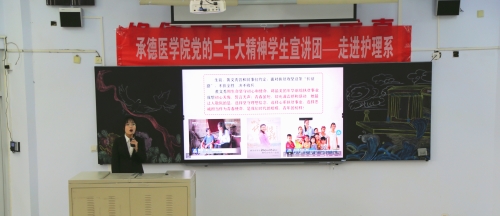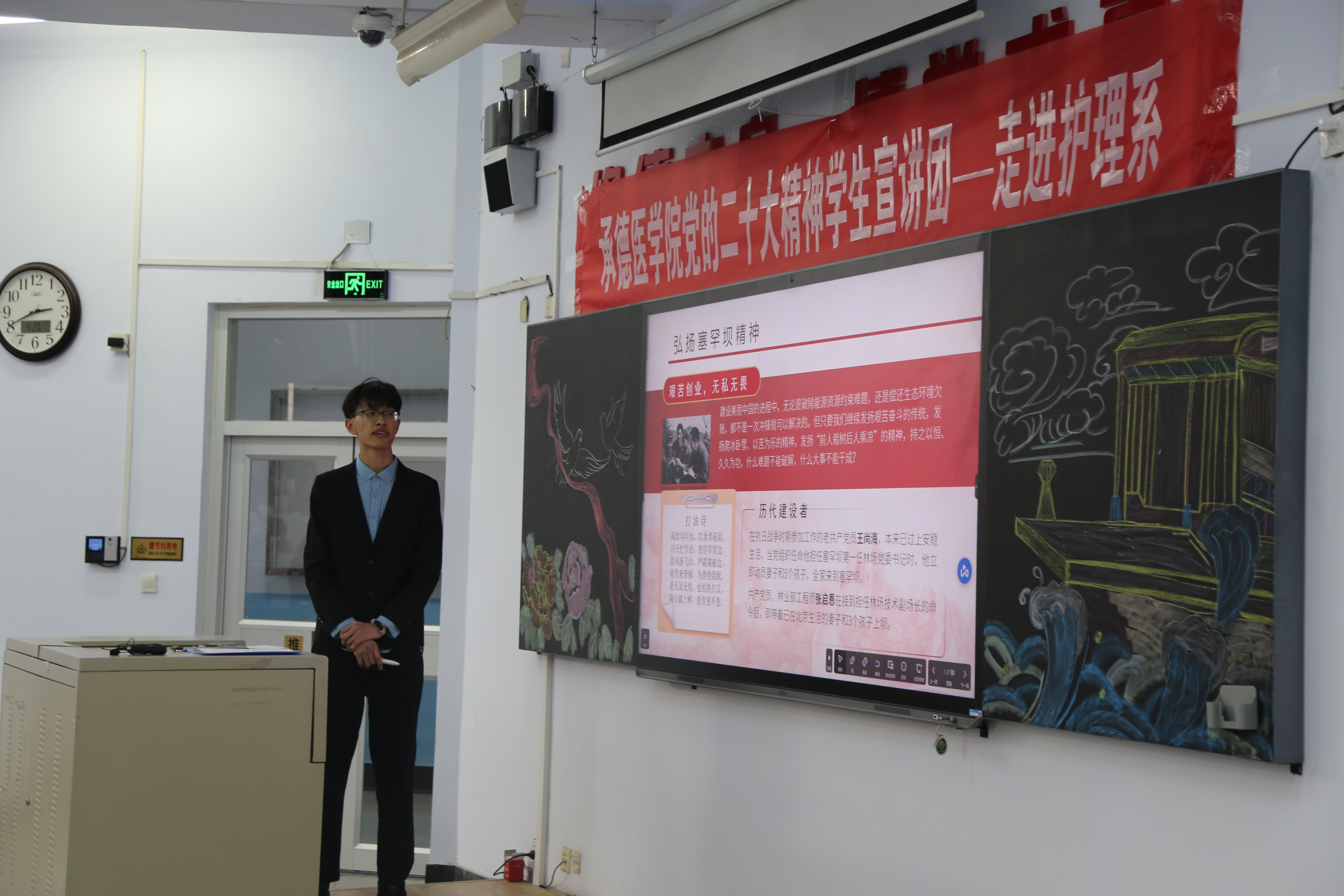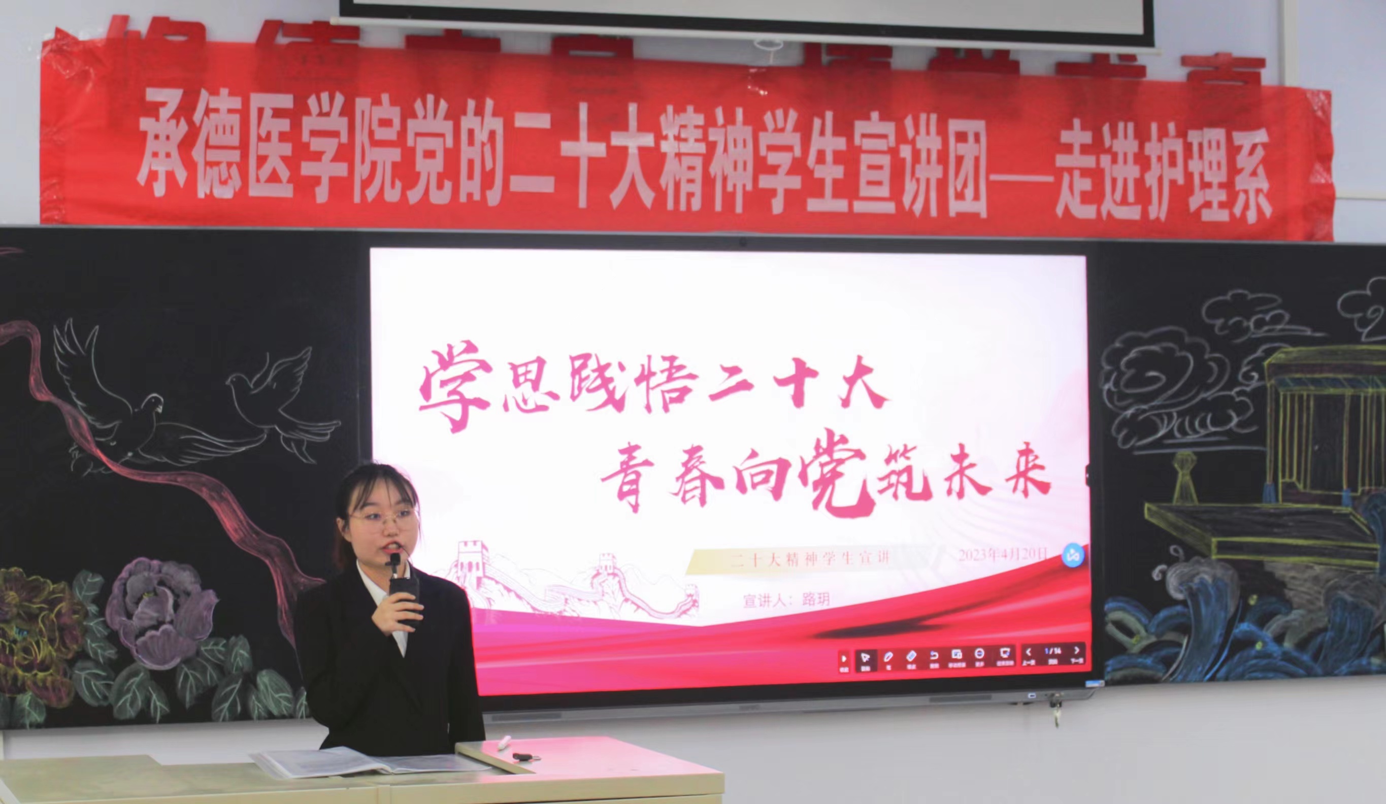 为深入学习宣传党的二十大精神和习近平总书记关于青年工作的重要论述,助力青年学子坚定理想信念、勇担时代使命,我校于2023年4月20日下午在教学楼举办了“学习党的二十大,凝聚新动力,奋进新征程”——党的二十大精神学生宣讲团走进护理系”活动。学生处、护理系相关领导、老师及护理系学生参与了本次活动。 护理系邵永琛、中医系李泽婵、基础医学院郭子豪、护理系路玥4名宣讲团成员逐一讲述,用青年视角、青年声音,帮助同学们仔细领会党的二十大精神,提升思想觉悟、坚定理想信念。 (点击每张图片即可查看原图)