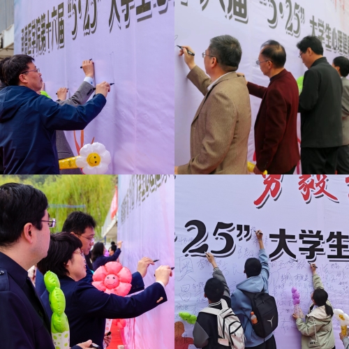 全场同学热情挥舞手中的太阳花迎接5·25大学生心理健康节的到来 张凯致开幕辞。他表示,抓好大学生心理健康教育是践行党的二十大精神、贯彻落实习近平新时代中国特色社会主义思想的需要,更是培养大学生的良好心理素质,提升学校心理育人工作质量的需要。全体师生要以本次心理健康节系列活动为契机,全面普及心理健康知识;要明确目标,找准方向感;要增强实效,找到幸福感,全力做好后疫情时代师生心理调适。 校领导及相关部门负责人共同开启本届“5•25”大学生心理健康节,并在活动展板上签字,助力守护师生心理健康。