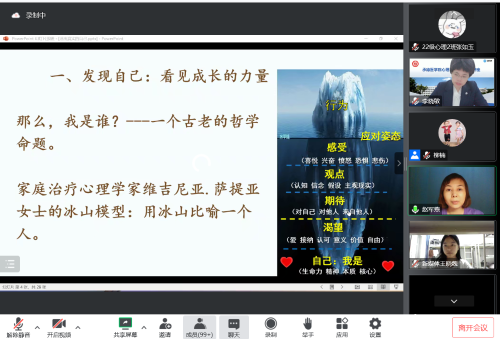 “5.25”谐音“我爱我”,旨在提醒大学生关爱自我、了解自我、接纳自我,关注自己的心理健康和心灵成长。值此5.25大学生心理健康节之际,心理学系邀请到首都师范大学心理素质教育与咨询中心主任、中国科学院心理研究所发展与教育心理学博士、中国心理学会临床心理学专业注册系统注册督导师、北京高教学会心理素质教育研究分会副会长赵军燕副教授为我校师生带来《活出真实的自己》的专题讲座。 本次讲座前期通过“承医心理系”微信公众号和师生转发传播进行宣传推广,讲座海报发出以后受到全校师生和社会各界广泛关注,并以“到梦空间”等方式组织签到,参与人数高达5000余人次。2023年5月11日晚七点,讲座准时开启,讲座由心理学系主任李晓敏主持。 李晓敏对赵军燕的到来表示热烈欢迎。随后,赵军燕借助萨提亚冰山模型开始讲述我们应如何更好的发现自己。讲座过程中,赵军燕通过冥想、绘画等方式与同学们深入互动,加强同学们的参与感和体验感,让学生切身切实在思考与书写中为自我赋能。通过对学生们生活中经常遇到的实际情况的分析,赵军燕从镜观当下、共通人性、善待自我三方面深入浅出地解释了怎样联结自己的生命力,如何学会为自己的生命注入蓬勃之源。最后,赵军燕鼓励学生们要欣赏自己,挖掘自身资源,绽放独一无二的自我,与会师生在讲座过程中热情回应、积极参与。临近尾声,同学们纷纷提出自己的问题,赵军燕耐心的回复并提供建议。近4小时的讲座让与会师生觉得受益匪浅、回味无穷。 (点击图片即可查看原图)
