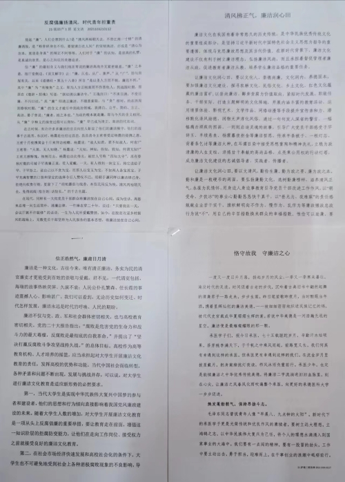 廉洁文化是中华民族优秀传统文化,为深入学习贯彻党的二十大精神,推动新时代廉洁文化建设深入开展,护理系学生第一党支部联合学校纪检委监察室、护理系2021级本科第八团支部于5月开展了“廉洁润初心,铸魂担使命”校园廉洁文化宣传教育活动。 活动过程中,支部党员、入党积极分子及青年团员响应号召、积极参与。在“廉心文语”征文活动中,参赛者用文字讲述“廉洁清风”,抒发真切情感,作品中有赞扬克己奉公人民“好公仆”的正面例子,也有鞭挞未能坚守住道德底线的反面教材;在“润心话语”手抄报征集活动中,大家用画笔勾勒廉洁印记,描绘廉洁情怀,用赏心悦目的图文、新颖独特的版面设计,创作出了一幅幅寓意深刻、表现力强的倡廉手抄报作品。支部成员们在活动中学习、在学习中成长,充分展现了“藏于心”“刻于骨”“现于行”的廉洁情怀,大家纷纷表示受益匪浅。 此次活动以大家喜闻乐见的方式深入推进廉洁文化进校园,对厚植校园廉洁文化起到积极作用。在今后的学习和工作中,支部成员将常怀律己之心,常思廉洁之德,努力做廉洁文化的学习者、实践者和传播者。 (点击每张图片即可查看原图)