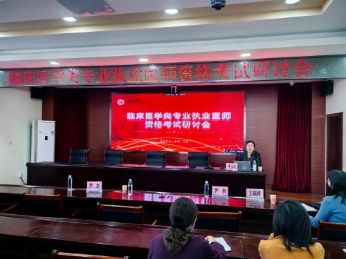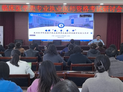 尹剑教授作报告 最后,李玉红结合本次研讨会的深刻感受,结合我校实际,从“教、学、考、评、管”五个方面,对今后的工作提出要求,进行了工作部署。她指出,临床类职业医师资格考试是国家级考试,是检验学校办学质量的全国标准,此后,学校将继续加强医学教育培训工作,为临床医学教育工作者与考试评价专家搭建沟通交流平台,希望大家凝聚共识,明确方向,夯实医学教育质量,持续提升我校教学实力,为医疗卫生行业输送高素质应用型医学人才。
