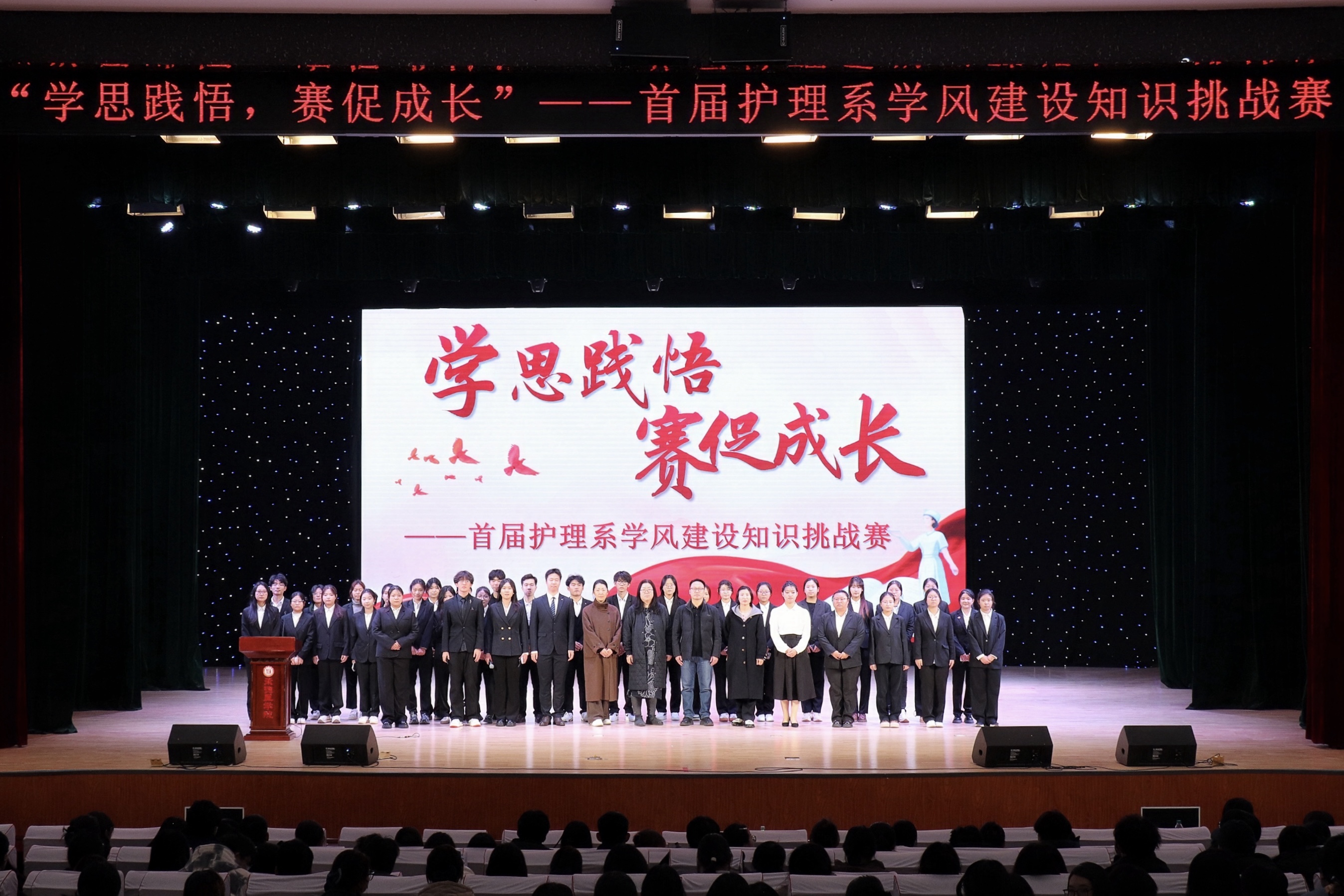 为夯实护理学子的专业基础,搭建跨年级学术交流平台,营造勤学善思的优良学风,展现护理系学生锐意进取的精神风貌,11月7日,“学思践悟 赛促成长”首届护理系学风建设知识挑战赛在学校礼堂顺利举行。全系师生齐聚一堂,以竞赛促进学习,以交流增进友谊,共同开启一场知识与智慧的较量。 本次活动面向护理系全体在校学生,采取“现场笔试+观众互动答题”相结合的形式,全过程坚持公平、公正、公开的原则。 笔试环节,各年级辅导员依据学号随机抽取参赛学生。被抽选的同学在指定区域就座,作答对应年级的专业试卷。答题过程中,同学们认真思考、从容作答,展现出扎实的知识积累与严谨的学风。笔试进行期间,现场同步开展了互动抢答环节。主持人围绕护理学专业知识进行提问,台下学生踊跃参与、积极应答。回答正确的同学获得精美礼品,现场气氛活跃,掌声不断。