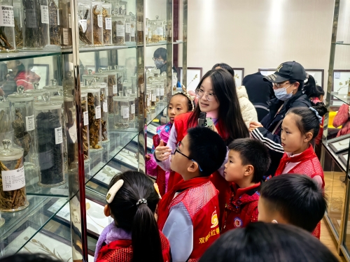 活动合影 活动伊始,红领巾志愿者们走进药用植物园。大学生志愿者生动讲解了黄芩、苍术等中药的生长特性,引导小志愿者们仔细观察药用植物在秋季的叶片纹理、种子形状。随后,红领巾志愿者们参观了中药标本馆。馆内整齐排列的植物、动物和矿物药标本令孩子们目不暇接。大学生志愿者通过讲解不同中药标本的药用部位及功效,帮助小志愿者们建立起对中药性状的初步认知,激发他们对中医药文化的探索兴趣。
