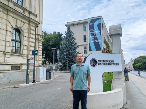 2025年4月承德医学院广场 2010年从石河子大学肿瘤学研究生毕业后我从事了核医学专业,利用放射性核素诊断和治疗肿瘤,赶上了中国核医学快速发展的机遇期。2013年我在全国排名第一的北京协和医院核医学科学习,了解中国核医学的发展。2025年我来到了有着600年历史的维也纳医科大学学习,附属医院维也纳总医院是欧洲最大的医院之一,NEWSWEEK世界医院全球排名第25位,医学影像与核医学专业全球排名第19位,了解欧洲和世界核医学的发展。作为承德医学院毕业的学子,我时刻谨记在校求学时老师的教诲,无论走到哪里都要成为学校的一面旗帜。