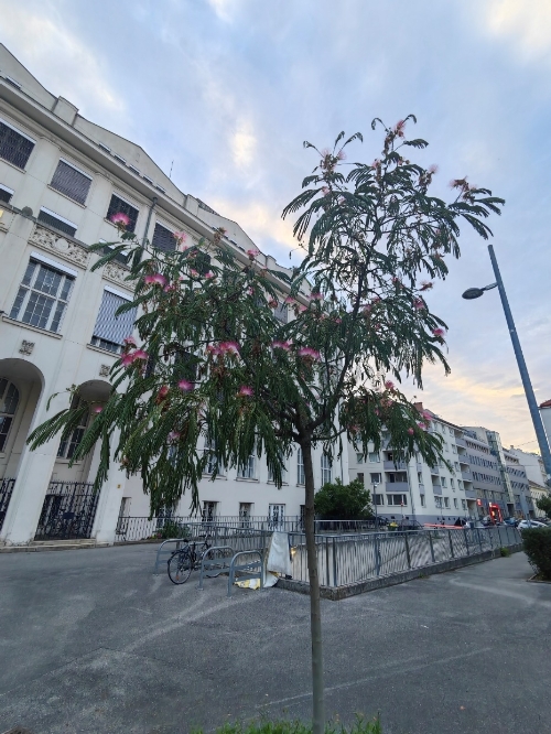 韩素华老师培育的新合欢树 2025年7月我受单位委派来到奥地利维也纳医科大学维也纳总医院核医学科做访问学者,无意之中在维也纳大学考古研究所的楼前,看见了两株小小的合欢树,我的思绪穿越了23年,回到了2002年那个8月,承德医学院老校区的解剖楼前。