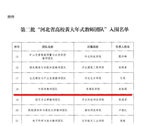 近日,河北省教育厅正式公布第二批“河北省高校黄大年式教师团队”创建示范活动入围名单,以我校中药学系主任赵春颖教授作为负责人的中药学教师团队,凭借卓越的综合实力与突出的育人成果,成功入选。这是我校教师队伍建设的又一重要里程碑,彰显了学校在师德师风、教育教学与科研创新方面的深厚底蕴。 中药学系作为河北省首批一流本科专业建设点,底蕴深厚,成绩斐然。中药学教师团队不仅拥有国家级一流课程、省级一流课程、省级课程思政示范课程等多类优质教学资源,更锻造了李保国省级先锋队,全国党建工作样板支部等先进集体。团队成员屡获殊荣,汇聚了国家中药材产业扶贫技术指导专家、河北省中药材产业技术创新体专家、河北省高校百名优秀创新人才、河北省中医药教学名师、“三三三人才工程”人选、河北省有突出贡献中青年专家、河北省中药材种业创新团队、河北省中药材创新驿站首席专家等众多高层次人才,形成了结构合理、优势叠加的一流师资方阵。 团队尤为注重人才梯队的代际衔接与优势互补,形成“传承与创新”的有机结合,不仅保障了项目的攻坚能力,也形成了卓越的人才培养体系。团队在赵春颖主任的带领下,不断挖掘培育其在师德师风、教育教学、科研创新、社会服务等方面成果,引导团队教师以黄大年同志为榜样,恪守“心有大我、至诚报国”的坚定信念,践行“教书育人、敢为人先”的使命担当,弘扬“淡泊名利、甘于奉献”的高尚情操,树立“躬耕教坛、强国有我”的志向抱负,为我校建设医科大学的目标蓄势赋能,为谱写中国式现代化建设河北篇章提供人才支撑与智力支持。