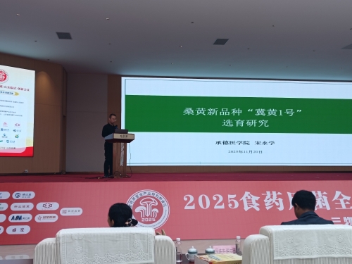 宋永学副研究员作为特邀专家代表参加圆桌论坛 在专题报告会环节,宋永学以《桑黄新品种“冀黄1号”选育研究》为题作了专题报告。他系统介绍了项目背景和目标、详细讲解了“冀黄1号”选育过程与栽培技术要点,并对其推广应用前景进行了展望。会上,其他专家学者围绕基因编辑、菌渣资源化利用、药食同源、桑黄产业发展等前沿方向分享了研究成果。