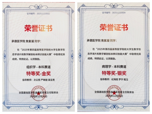 获奖证书 本次大赛由全国基础医学形态学实验室主任联席会与山东数字人科技股份有限公司主办、山东大学齐鲁医学院承办,分为线上决赛与线下总决赛两个阶段。线上比赛中,焦紫凝同学在组织学和病理学两大赛道均展现出极强的专业竞争力,双双荣获国家级一等奖,成绩均位列全国前1%,成功获得线下总决赛入场券。 总决赛侧重于大体标本与切片观察、临床思维、科研创新、现场答辩等核心能力考核。面对来自全国各高等医学院校的顶尖选手,焦紫凝沉着应战,在数字切片抽签辨识、专业描述、鉴别诊断及创新表达等环节中展现出扎实的知识储备、清晰的逻辑思维和出色的临场把控能力,最终斩获双料奖项,充分彰显了我校在基础医学教学领域的扎实成效和人才培养质量。