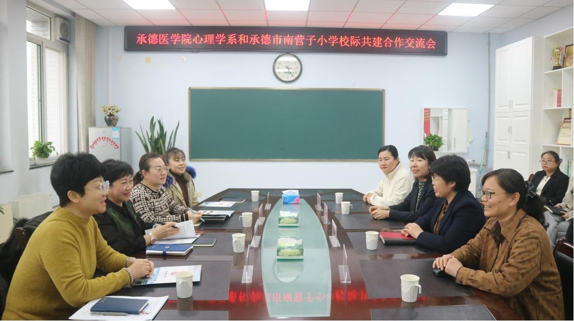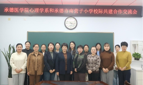为深化高等教育与基础教育协同育人机制,搭建心理学专业实践与未成年人心理健康教育的合作桥梁,2026年1月9日,我校心理学系与承德市南营子小学联合举办校际共建交流会。承德市南营子小学校长吴丽君、副书记石洁、副主任董金亚、德育处副主任孙苑应邀出席,我校心理学系全体教师参加本次交流会。