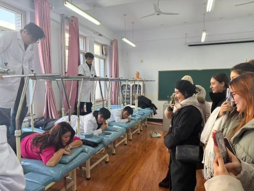 2026年1月6日至12日,乌兹别克斯坦KIMYO国际大学研学团师生一行11人来我校开展为期一周的学习交流活动。1月7日上午,国际教育学院举行欢迎暨开班仪式。随后研学团参观了基础医学研究所与河北省神经损伤与修复重点实验室。下午,中医系杨志新教授为来访师生举办“相对穴”学术讲座,生动展示了中医针灸的独特魅力。