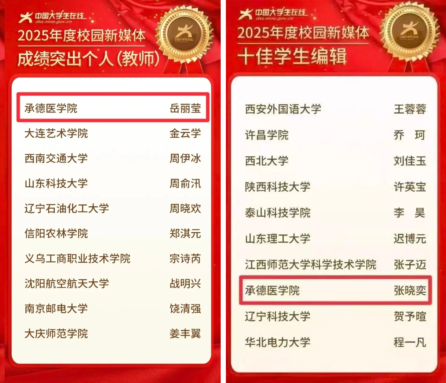 近日,教育部中国大学生在线正式公布了2025年新媒体年度表彰名单。在此次国家级评选中,我校师生表现优异,斩获两项重要荣誉:我校党委宣传统战部副部长岳丽莹荣获“2025年度校园新媒体成绩突出个人(教师)”称号,我校学生记者站学生张晓奕荣获“2025年度校园新媒体十佳学生编辑”称号。这一佳绩彰显了我校在校园网络文化建设与新媒体育人领域的扎实工作和突出成效。