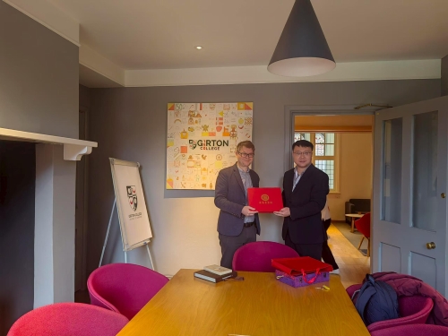 我校梁珈毓同学进行小组汇报展示 研学期间,带队教师丁实代表学校与剑桥大学全球项目部主任Nick Godfrey博士及项目授课团队进行了深入会谈,双方就本次学生的学习情况、未来课程优化方向以及进一步开展师生互访、学术合作等事宜交换了意见,为未来两校建立长效合作机制打下了良好基础。会谈后丁实向剑桥大学教授赠送礼品。