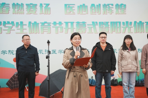 开幕式现场 开幕式上,王瑞婷副校长致开幕词。她强调,学生体育节是校园文化的重要组成部分,更是展现学子精神风貌、锤炼意志品质、凝聚奋进力量的重要平台。她寄语全体运动员,要秉持体育精神,以饱满的热情、昂扬的斗志、顽强的毅力投身各项赛事,奋勇争先、超越自我,严格遵守赛事规则,尊重对手、尊重裁判,赛出风格、赛出水平、赛出友谊,在竞技中磨砺意志、在拼搏中收获成长;希望全体裁判员、工作人员、志愿者坚守岗位、恪尽职守、密切协作,以严谨细致的态度、公平公正的准则做好赛事保障工作,全力打造一场安全、有序、精彩、圆满的体育盛会;希望全体同学以此次学生体育节为契机,积极参与体育锻炼,养成良好运动习惯,以强健的体魄、昂扬的精神风貌,扛起新时代医学生的责任与担当。